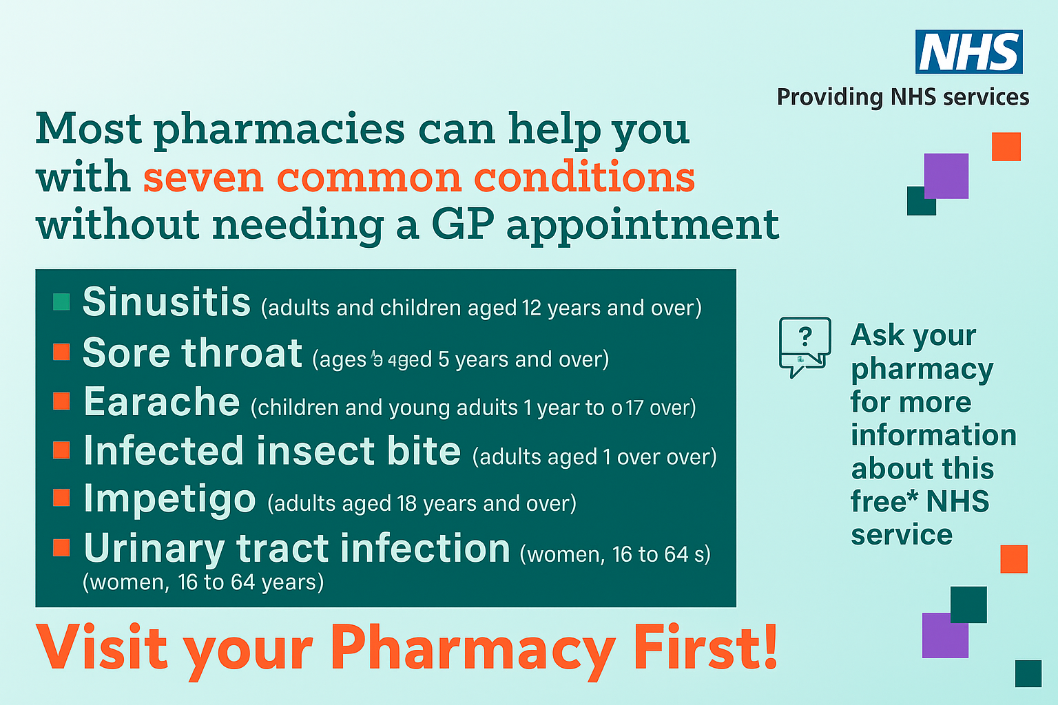 - Signposting to community pharmacy services, sexual health services, A&E